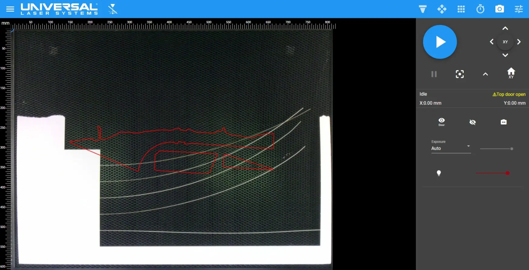 R5000 is equipped with a vision system. Open the lid all the way, select Camera View (top right third option from the left), then press the eye icon to see the bed and material. From here, you can switch back to Relocation View and drag the design to match your material position.