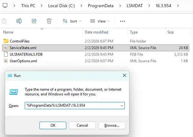 Press Windows key ⊞ + R and navigate to %ProgramData%\LSMDAT\16.3.954, overwrite the existing ServiceState.xml with the downloaded file and restart your computer to initialize LSM.