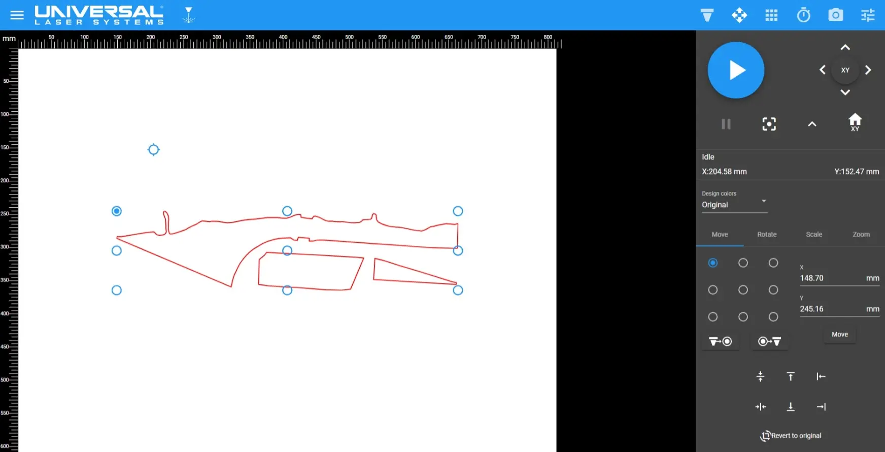 Then enter Relocation View (top right second option from the left) to align the file to the laser head. Just like VLS, there's a 9 point grid for alignment position, then press O-V to align the selected point with the laser head position.