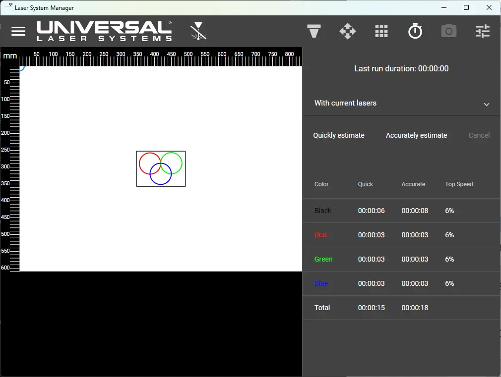Once you have all the cutting parameters configured, select Run-Time view (top right fourth option from the left), then click Accurately estimate to get the total amount of time needed for the job (HH: mm: ss).