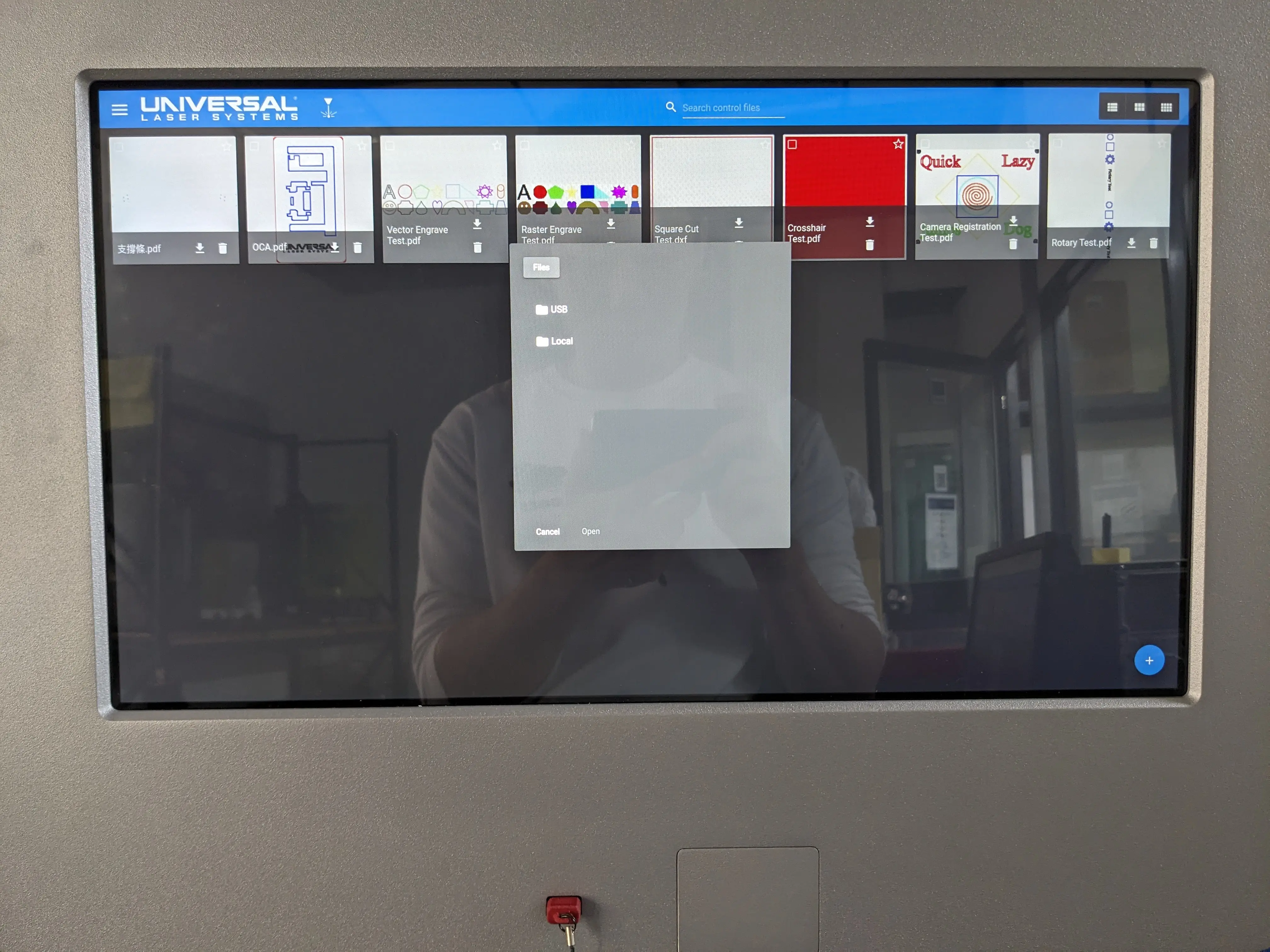 The touch panel also includes a USB port below the touch screen for file transfers. To copy the files from the USB, expand the menu on the left, and select Control Files, then select the + button on the bottom right.